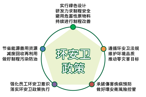 | 加强职业安全卫生管理 | 遵行职业安全卫生相关法规、工作守则,实施灾害统计并进行调查分析暨进行相关改善措施 |
