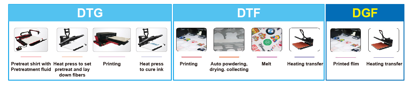 | 纺织品印刷 | 项目 | DTG | DTF | DGF🏆 |